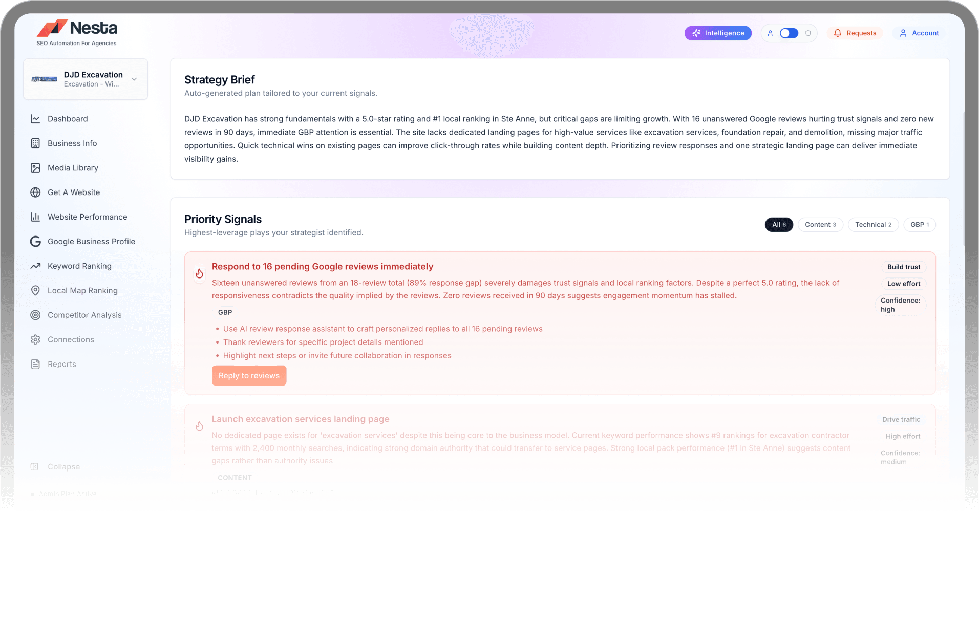 That’s why we built Nesta: to give you a powerful, unified, and truly intelligent way to see your complete local SEO picture and fix what matters—without the tech bloat, overwhelm, or endless guesswork. Our mission is simple: put real solutions in your hands, not just more reports.”